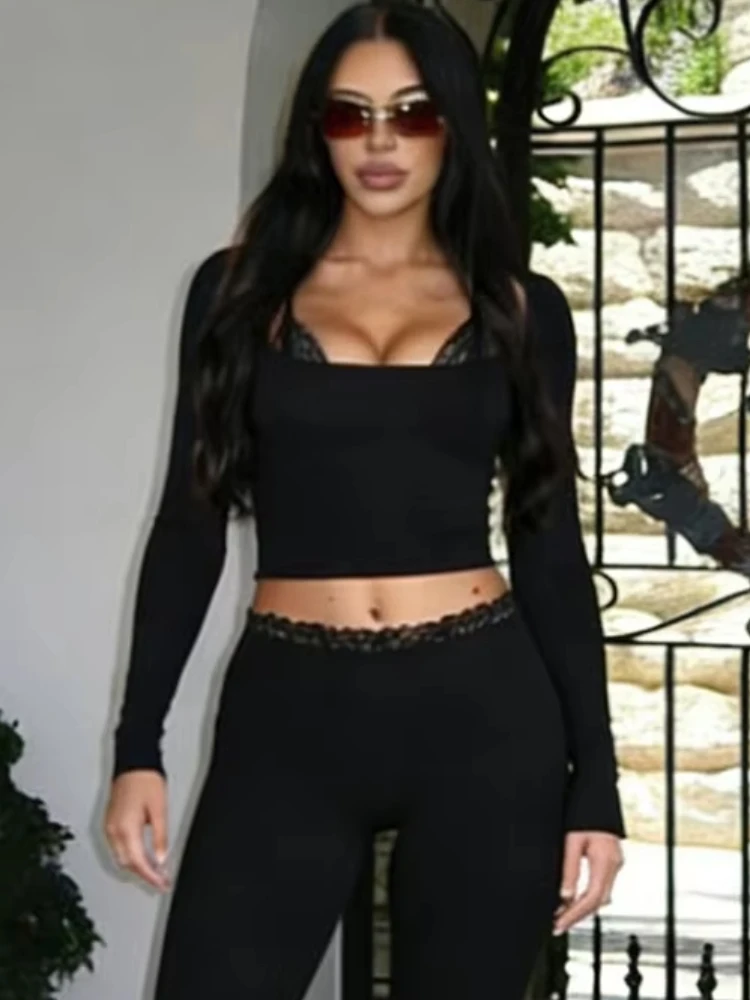 Weird Puss Patchwork Lace 2piece Sets Woman Summer Sexy Fungus Trim Spaghetti-Strap Tops+Chic Tierred Pants Party Skinny Outfits