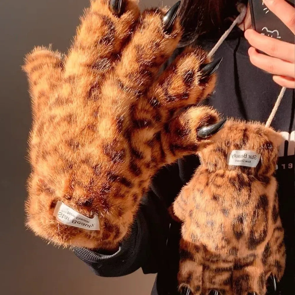 Winter Warm Furry Gloves Spicy Girl Cosplay Cool Props Tiger Claw Gloves Leopard Print Thickened Riding Padded Gloves Women Gift