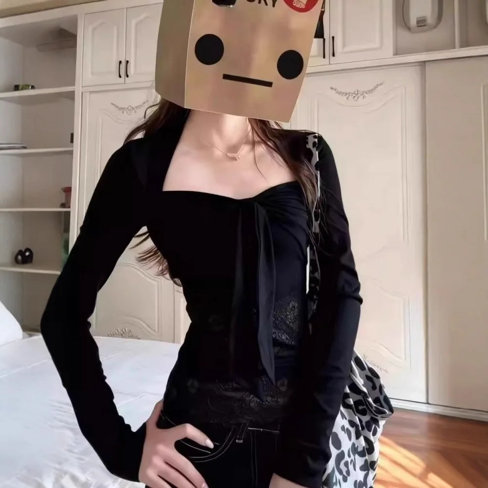 Y2K Sexy Spicy Long Sve Square Collar Slim Fit Warm Patchwork Top Trendy Commute Sle Thiened Dervo Material T-irt