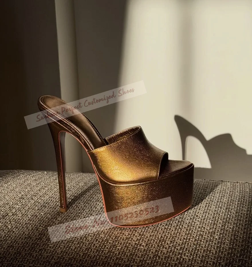 Golden Caviar Metallic Matte High Heel Mules Sky High Stilettos Platform Pull-On Modern Slippers Open Toe Elegant Dress Sandals