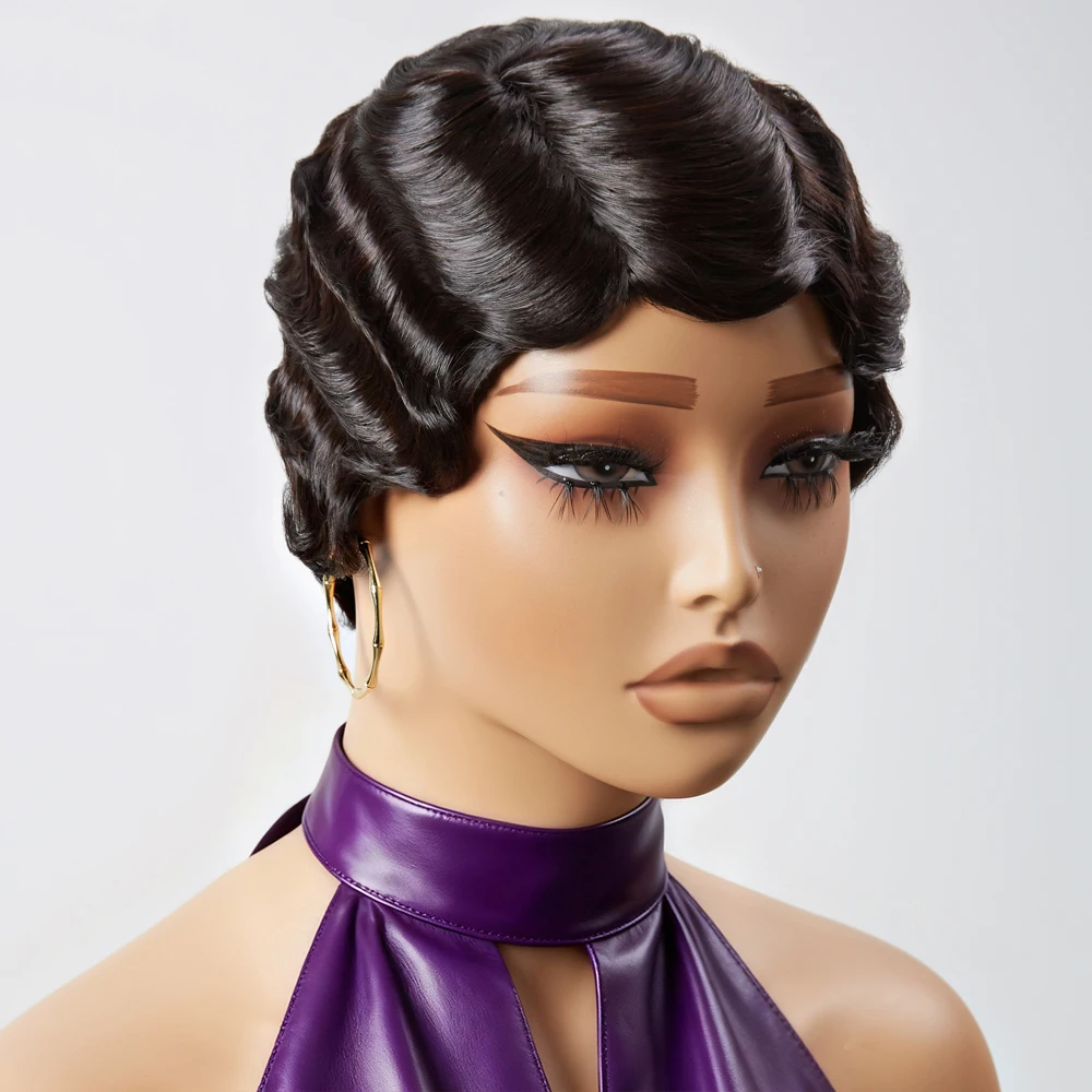 Pixie Cut Finger Wave Short Bob Wigs For Black Women Human Hair Ocean Wave Short Indian Human Hair Wig Full Machine No Lace Wigs