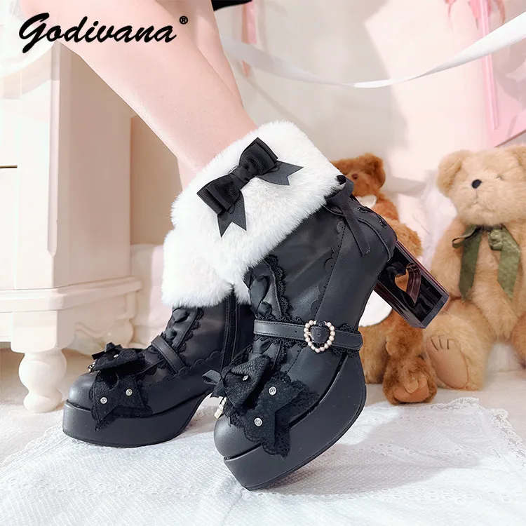 Japanese Style Ladies Sweet Furry Pink Boots High Heel New Autumn and Winter Girl Women's Cute Lace Bow Rhinestone Ankle Boots