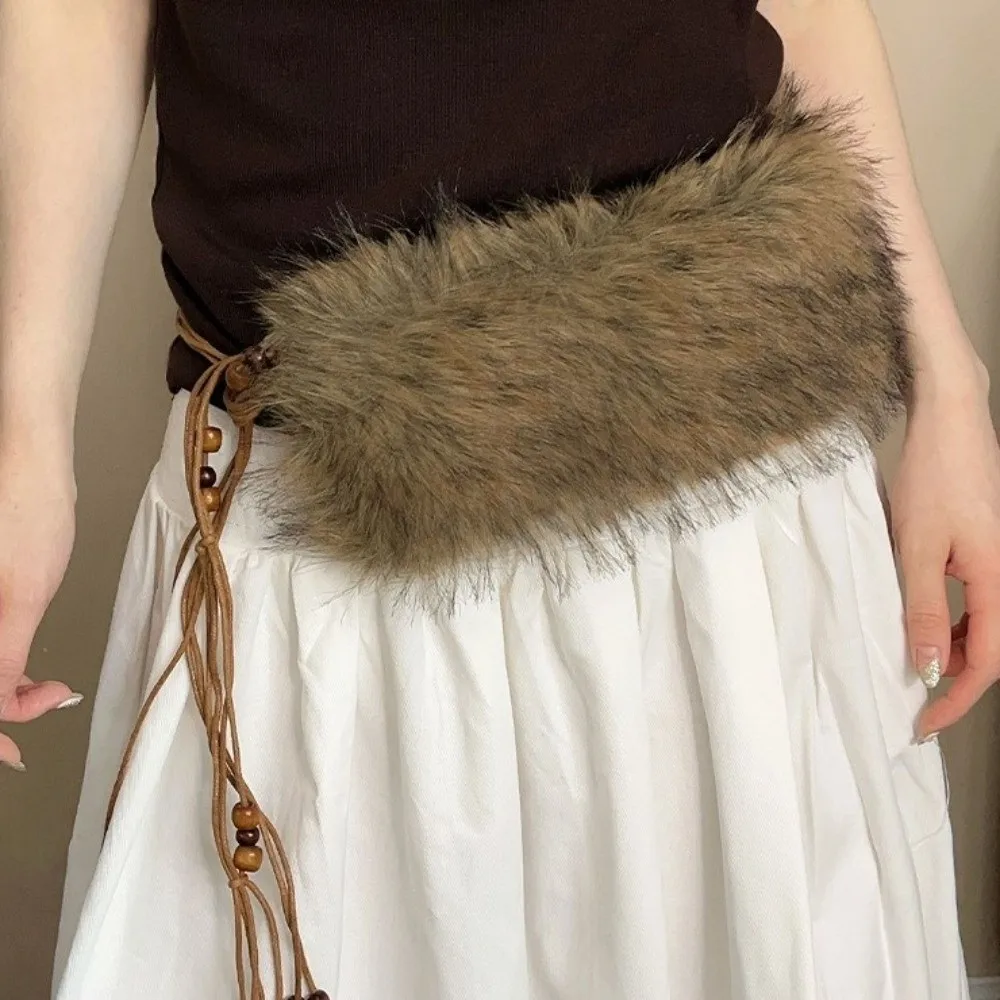 Y2K Fashion Y2K Fur Collar Scarf Wooden Bead Sweet Style Furry Waist Belt Punk Spicy Girl Waist Rope Jeans Decor
