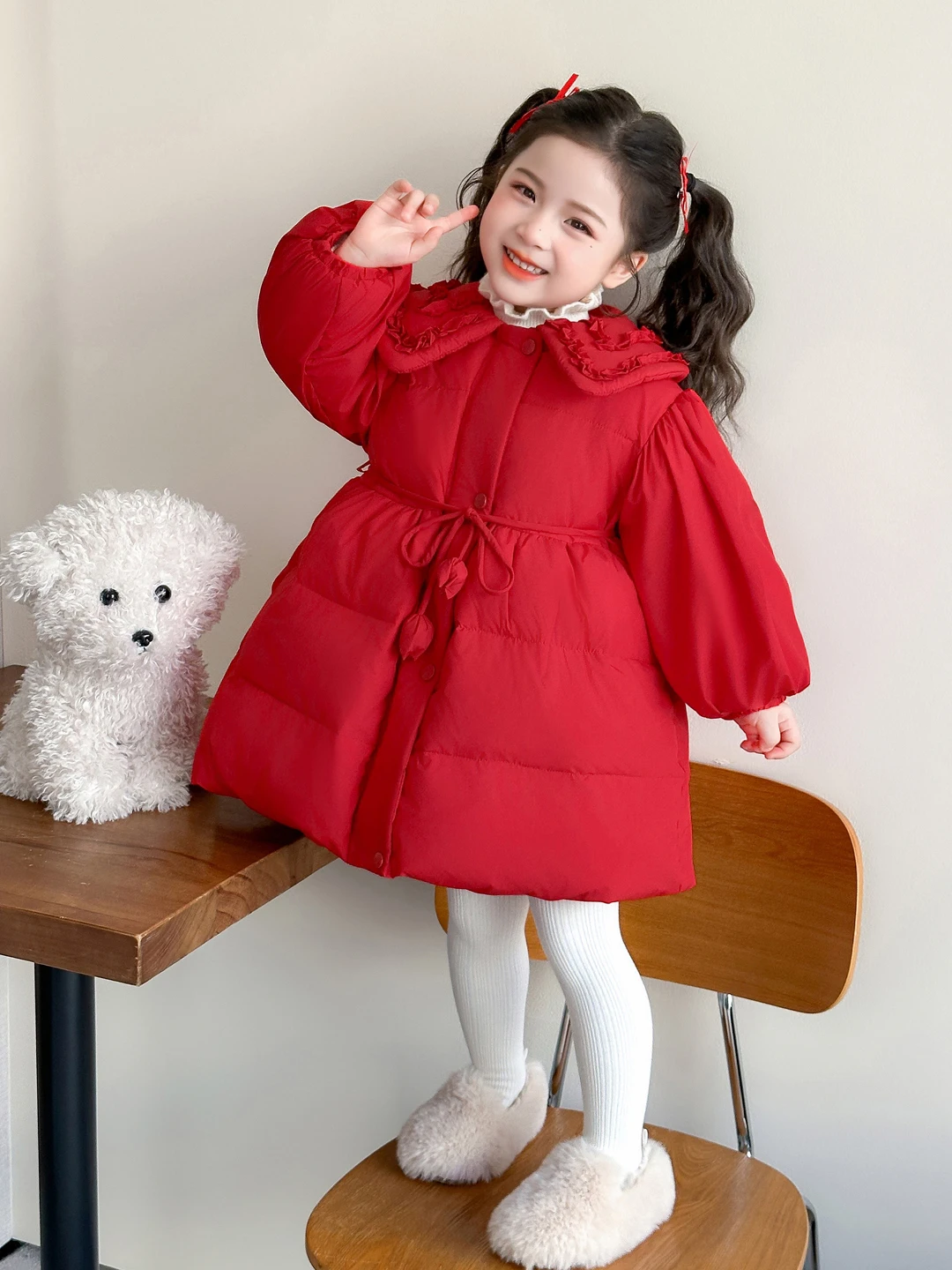 Girls Red Flower Bud Thiened down Jaet Winter Clothes Sweet Doll Collar Warm Cotton Coat Outerwear for Children