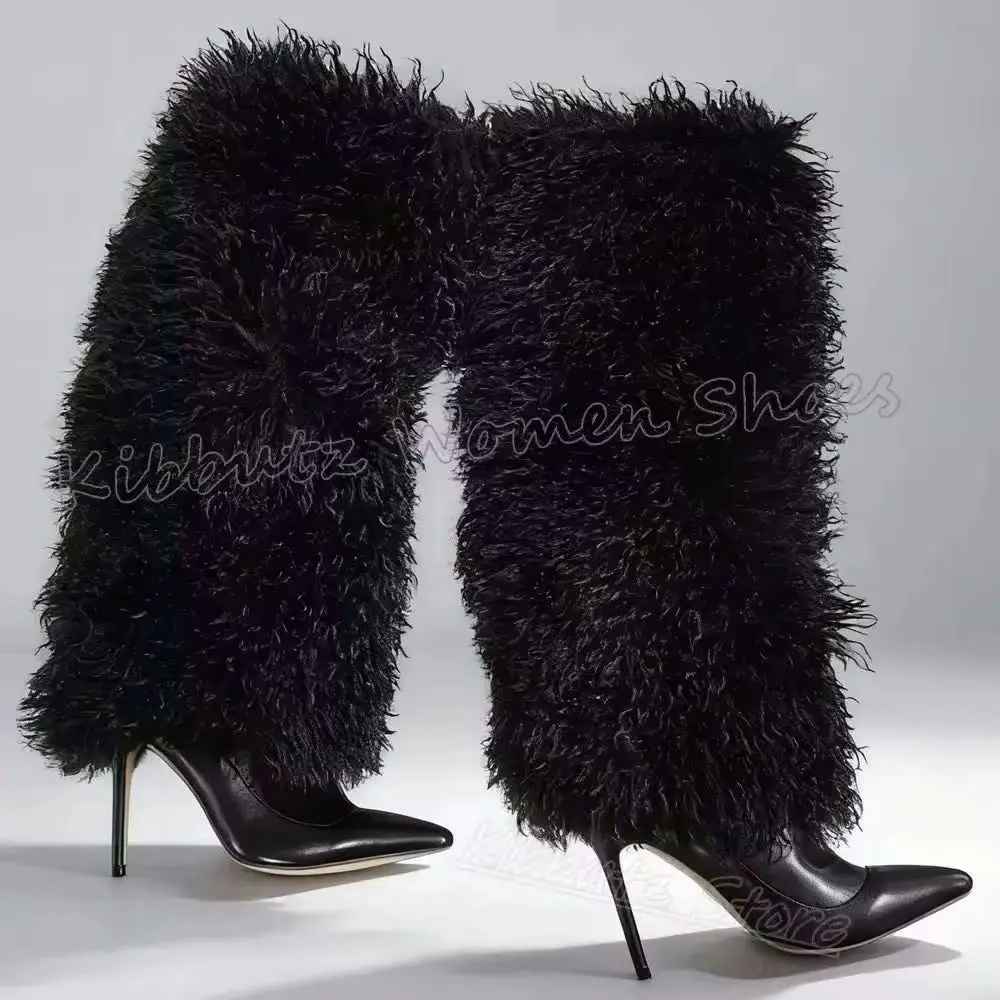Furry Knee High Boots Leather Warm Winter Spicy Girls Shoes Fashion Luxury Elegant Concise Pointy Thin Heels Solid Color Newest