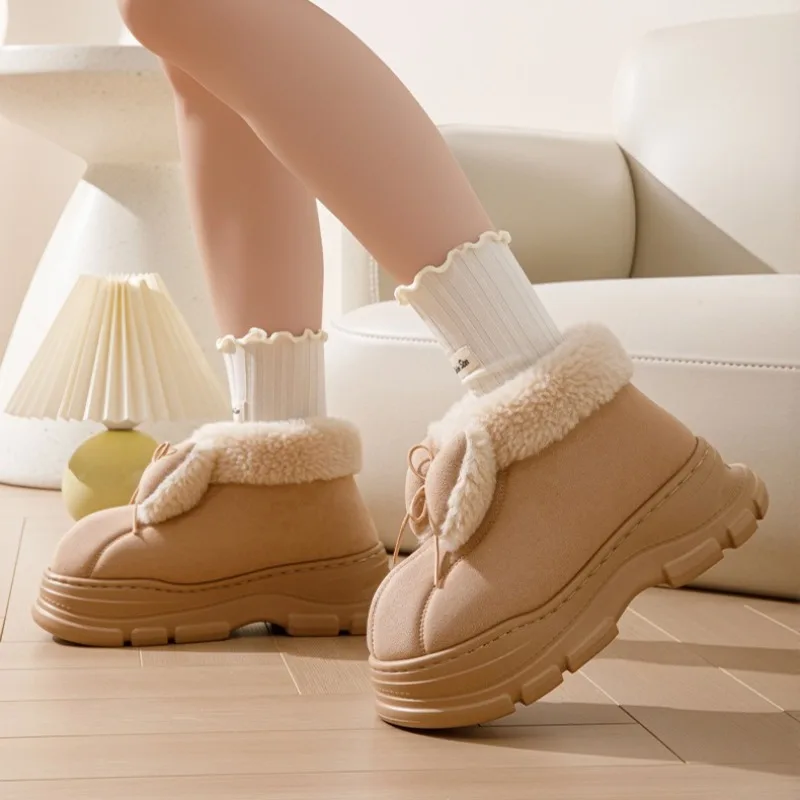 Thick Soled Butterfly Knot Women Cotton Shoes Winter 2025 Warm Furry Outdoor Non Slip Platform Faux Fur Street Girl Snow Boots