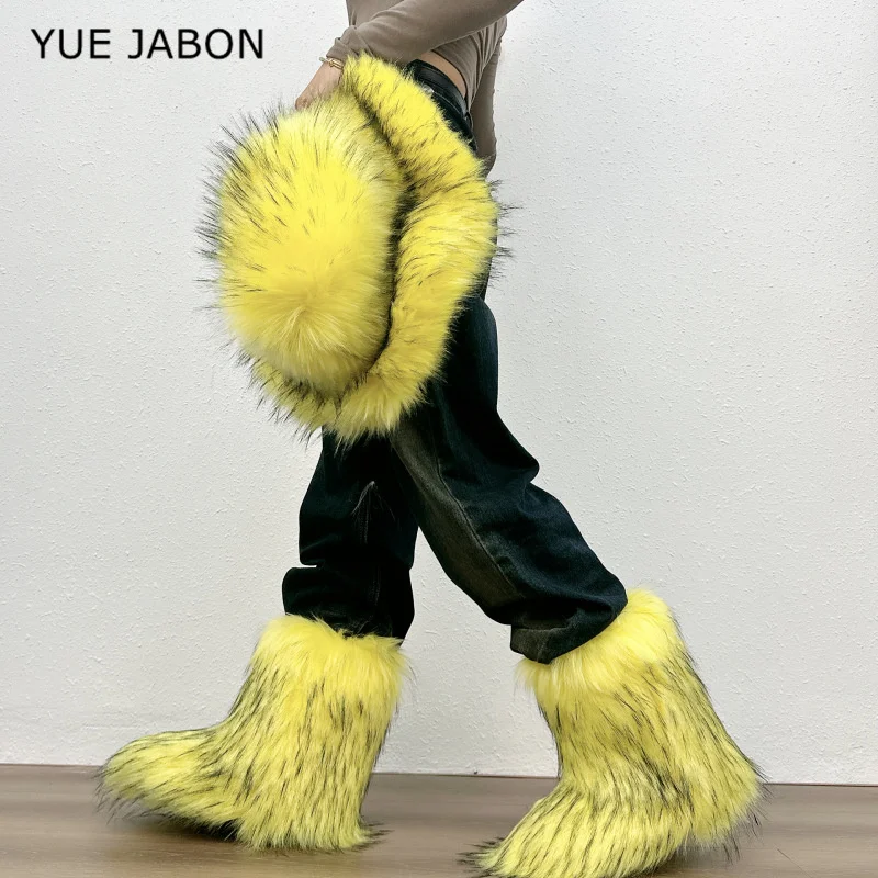 Yellow Women Winter Thick Fur Boots Woman Plush Warm Fluffy Snow Boots Luxury Footwear Girls High Quality Furry Faux Fur Booties