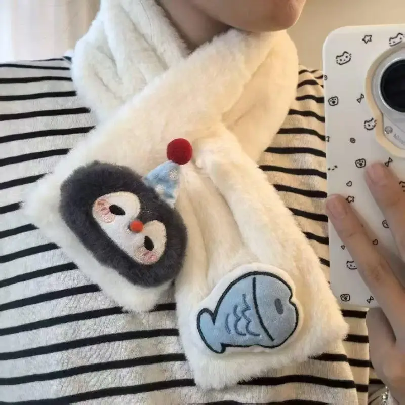 Cute Fish And Penguin Scarf Children Student Cross Furry Scarf Neck-protecting Kawaii Girls Winter Warm Plush Scarf