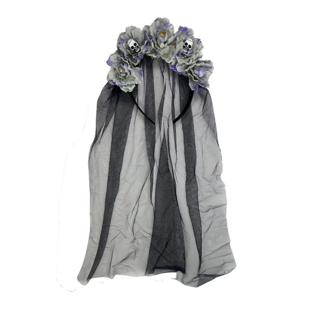 Long Ribbon Veil Halloween Hair Band Girls Day of The Dead Black Veil Flowers Headdress Skull Design Floral Gothic Head Hoop