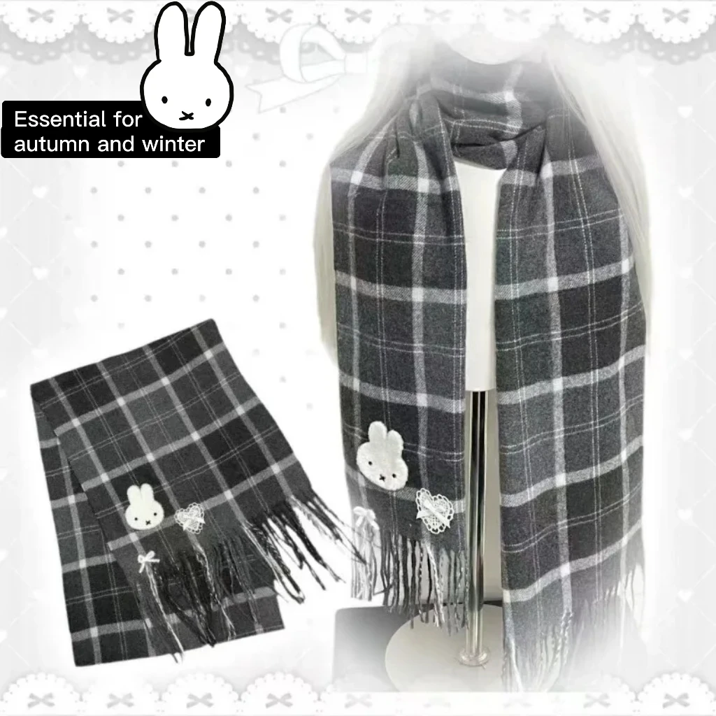Miffy Black Checkered Scarf Autumn Winter Warm Versatile Cute Scarf for Women Girl Fashion Cotton Stoles Scarf Christmas Gifts