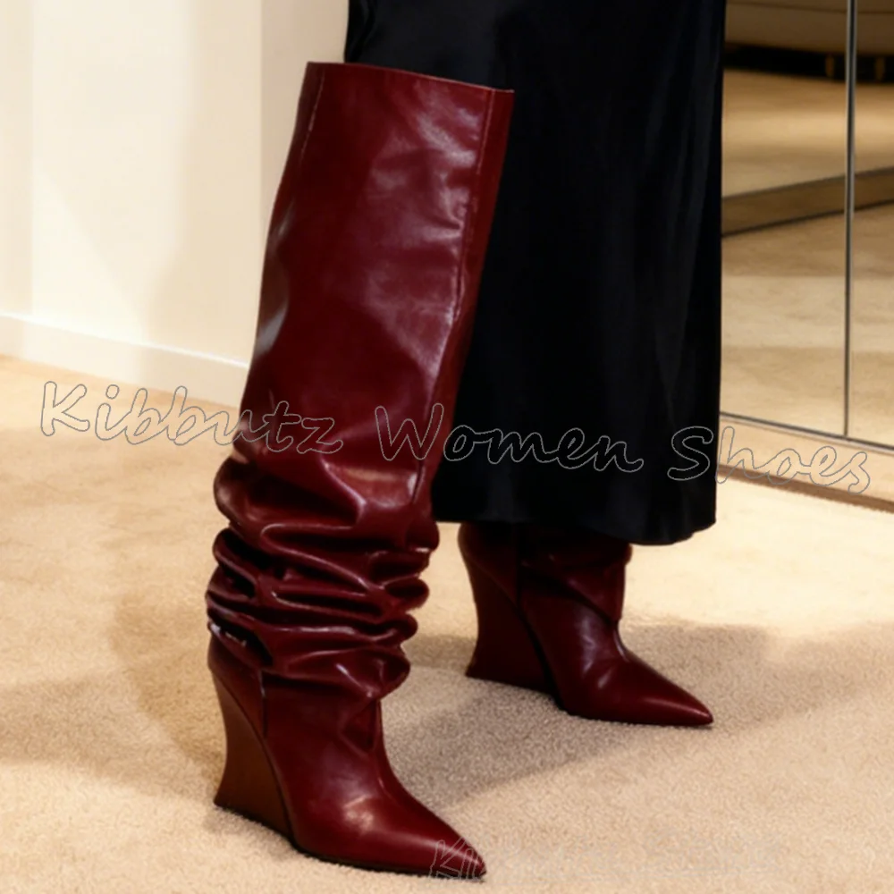 Knee High Boot Pleated Slip-On Leather Solid Color Fashion Luxury Elegant Concise Sexy Pointed Toe Wedges Spicy Girls Shoes New