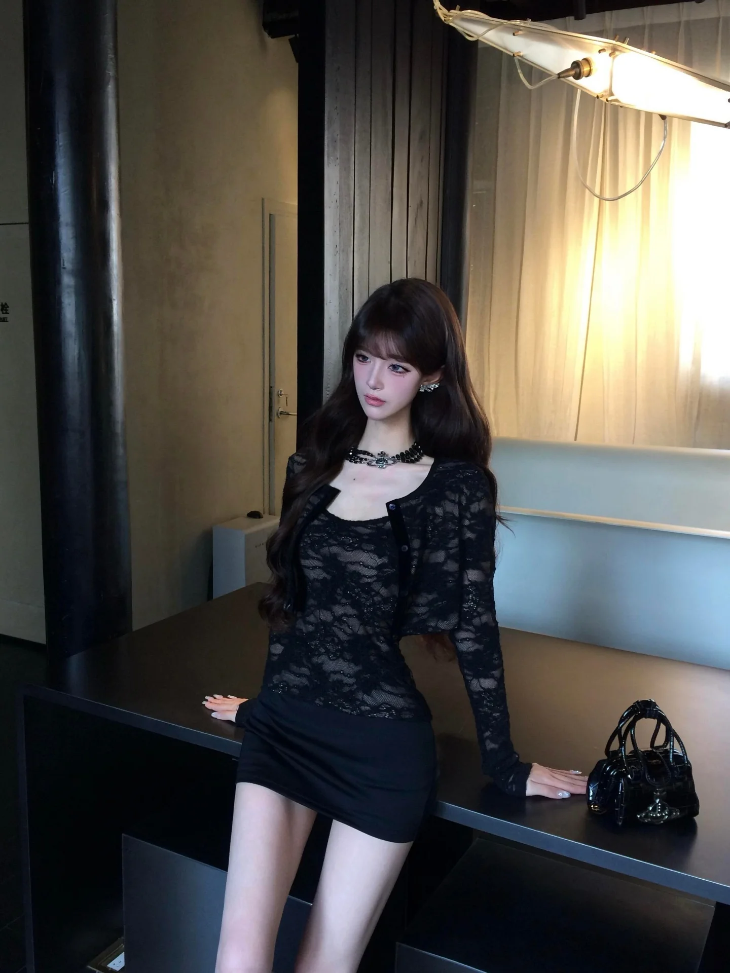 Sexy Lace Crop Top And Skirt Set Women's Autumn Winter Bla Open Cardigan Strap on Bodycon ort Skirt Whole Set Hot Girl
