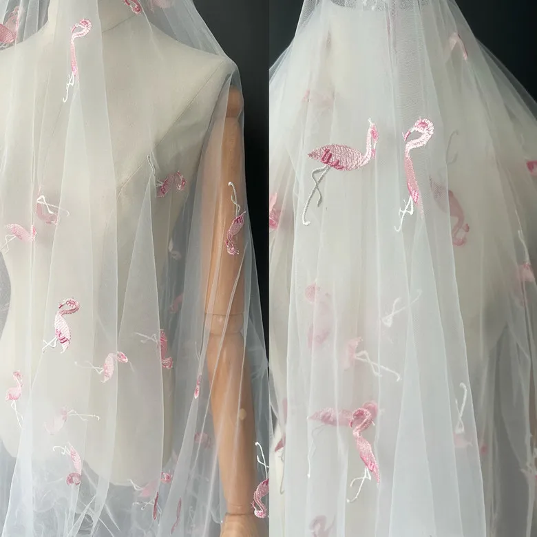 Off White Bird Cygnet Flamingo mesh yarn Embroidered Fabric children's dress clothing home fabric