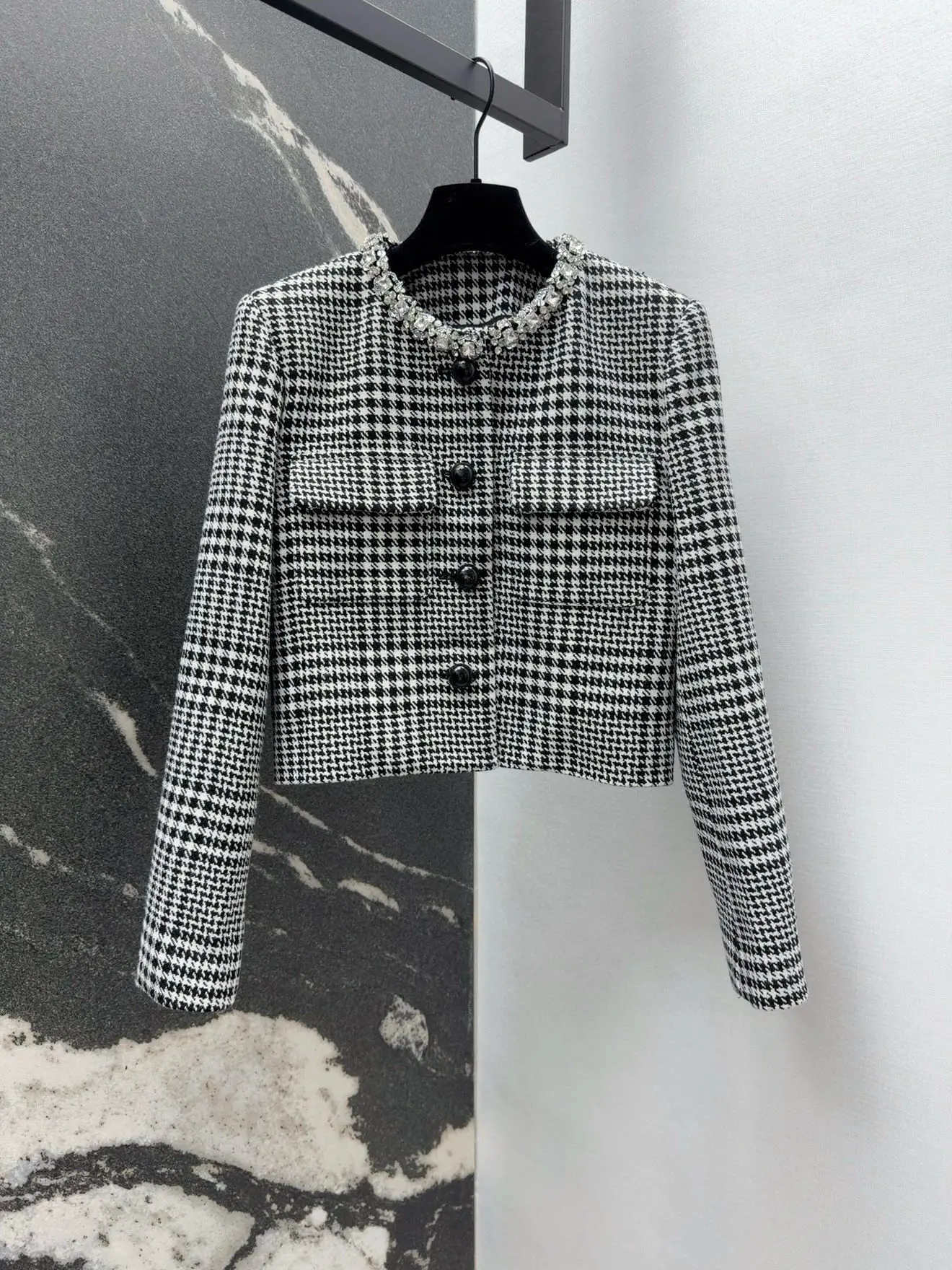 Vintage Black and White Thousand Bird Grid Women's Set Elegant Diamond Embroidered Round Neck Jacket with Shorts Two Piece Set
