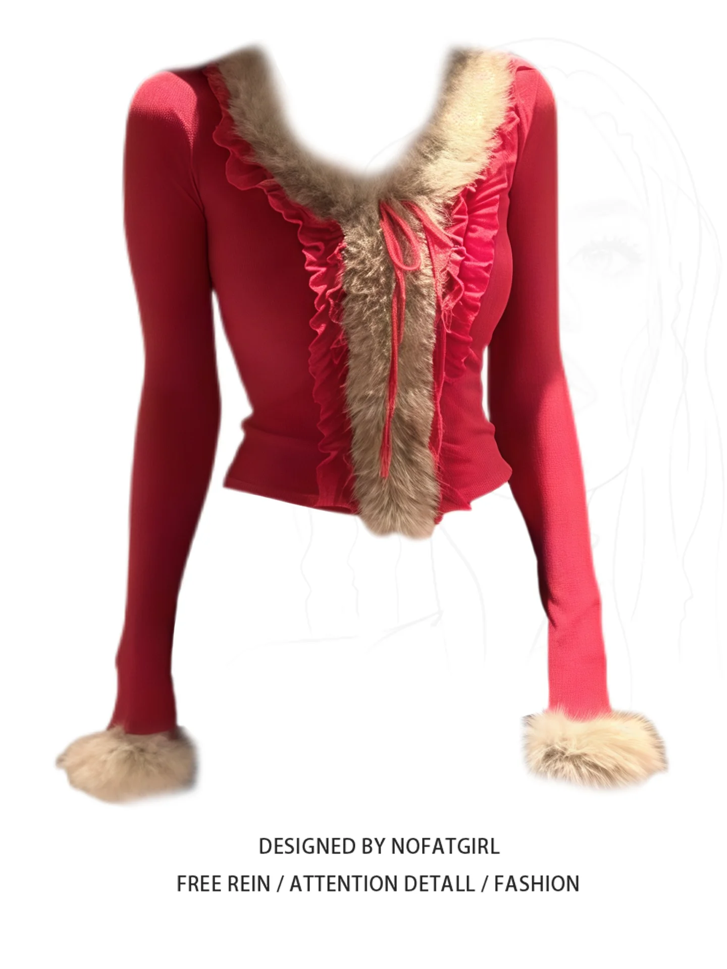 plus Size Women's Red Knitwear V-Ne Long Sve Furry Patchwork Slimming Autumn Winter Faionable Trendy Girl Sle Top