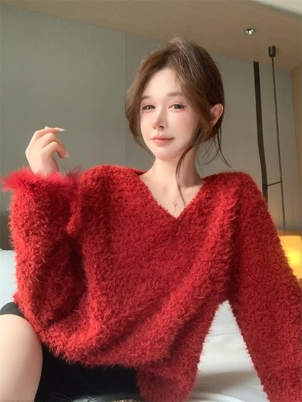 Cisas Red V-Ne Loose Furry Knitwear Women's Winter Pure Desire Spicy Girl Sle Fur Sve Base irt