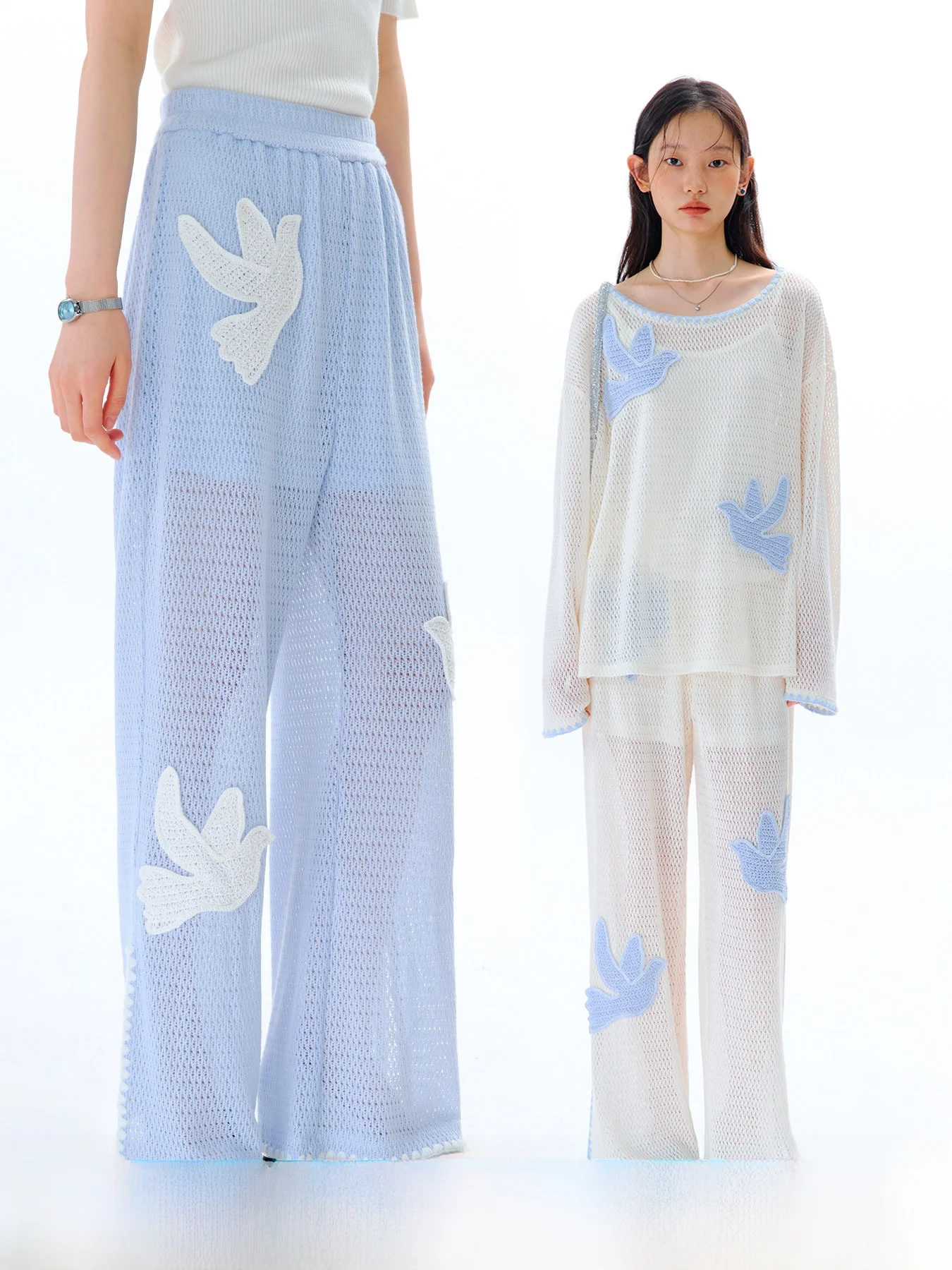 Loose Knitted Straight Leg Pants with Embroidered Bird Patch Long Casual Trousers for Women High Waist Wide Leg Commute Sle