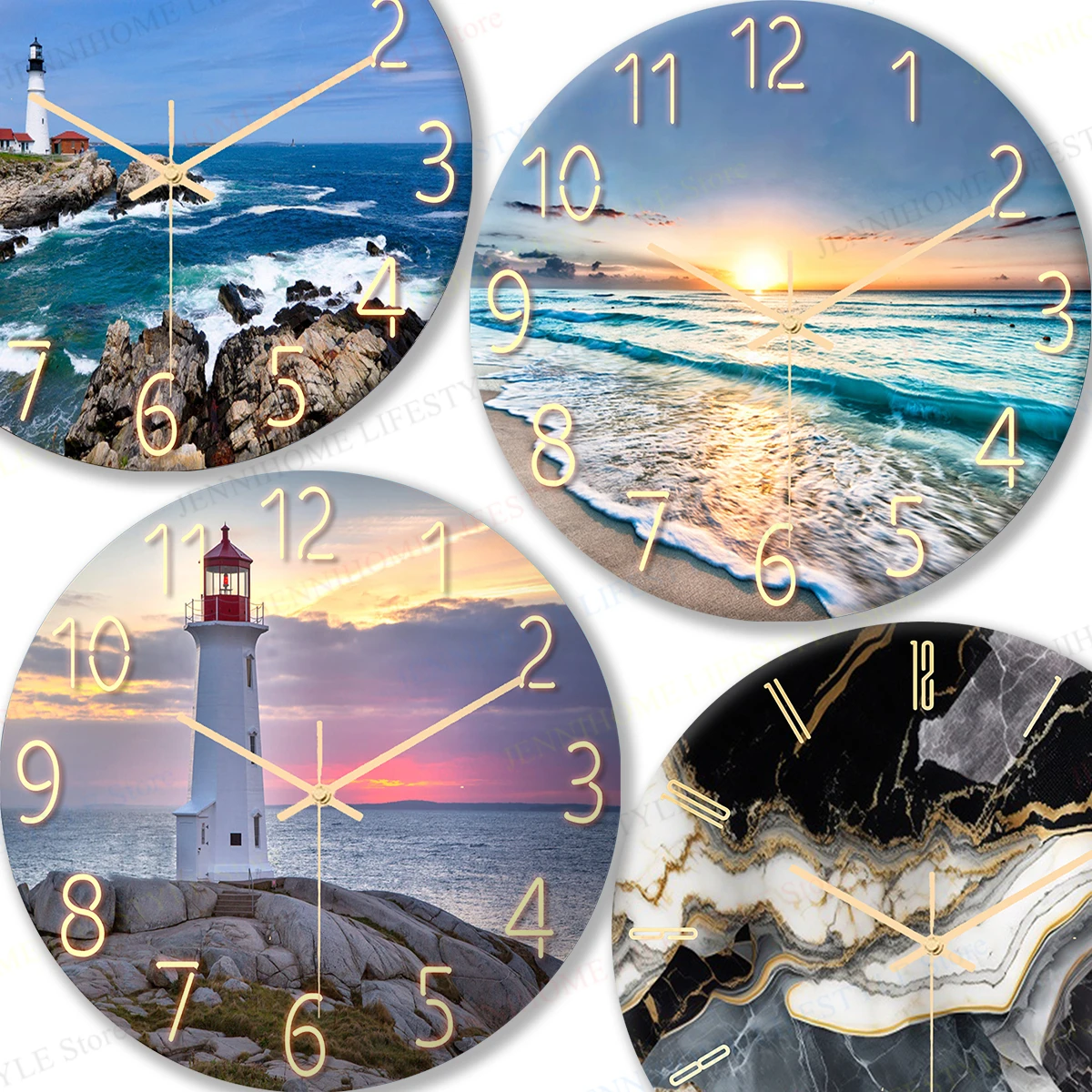 Beach Wall Clock Wall Art Clock Luxury Marble Watch Wall Mount Mechanic Clock Frameless Clock Wall Decor for Living Room Kitchen
