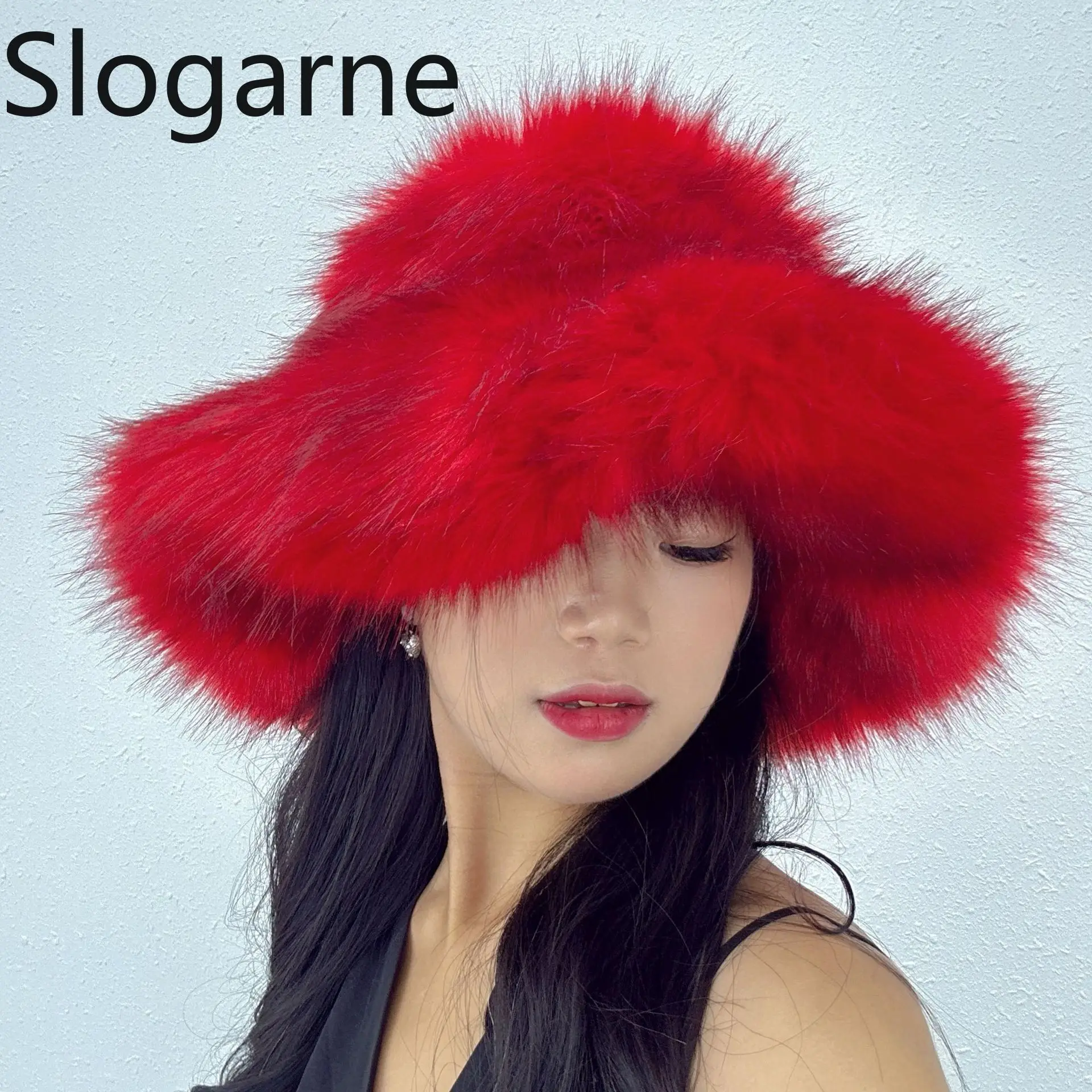 New Y2K Faux Fox Fur Bucket Hat Women Fluffy Fahiosn Fur Hats Girls Thick Furry Winter Caps Ladies Luxury Warm Big Brim Hats