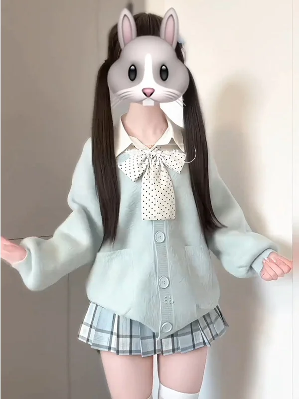 Original Warm Knitted Sweater Set Furry Layering Spring Jk orm ort Girl Cute Sister College Sle Long Sve V Ne Bu...
