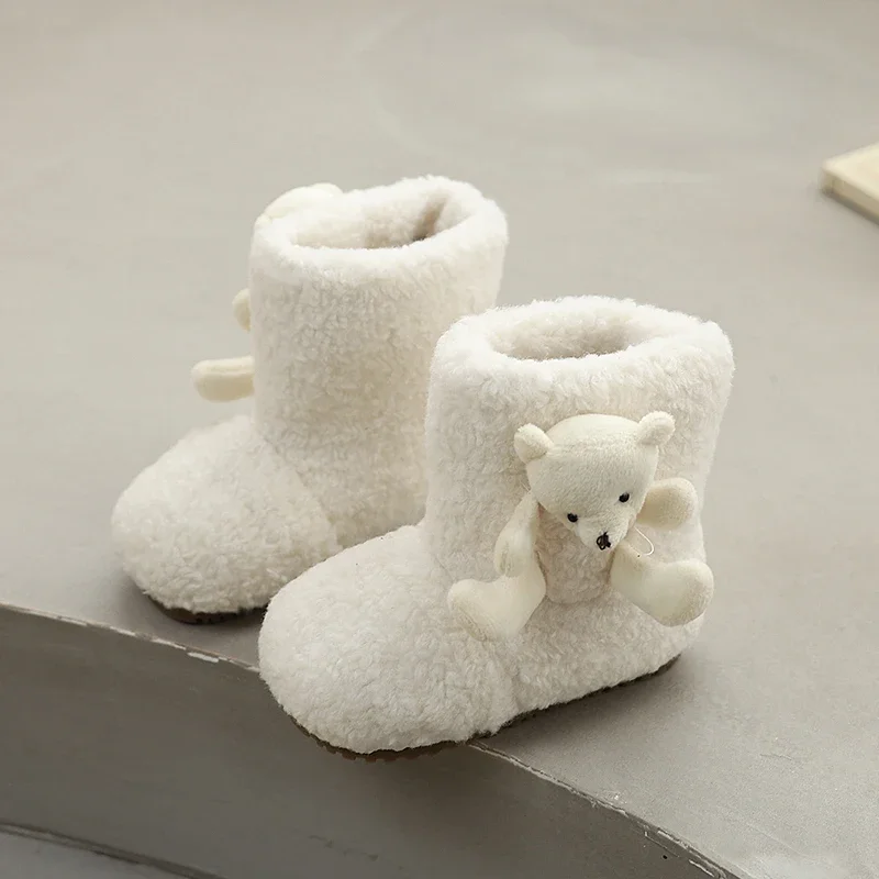 Winter Cute Children Outdoor Ankle Boots Sweet Bear Girls Fashion Warm Plush Boots Soft Furry Kids Princess Snow Boots Slip-on