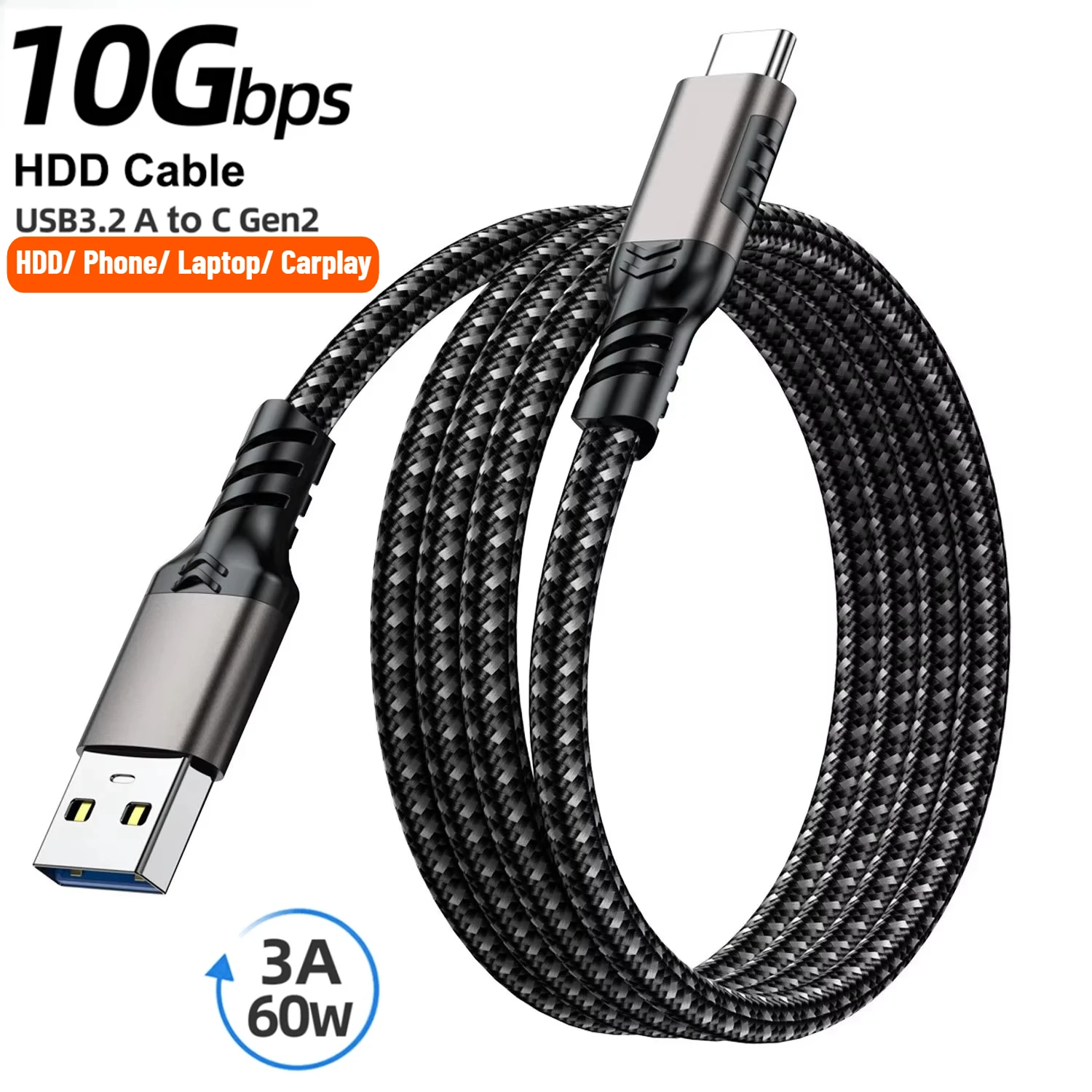 USB3.2 Gen2 10Gbps Cable USB A to C Cable 3A 60W QC3.0 Fast Charging for Carplay NVMe Hard Disk External Android Data Braid Cord