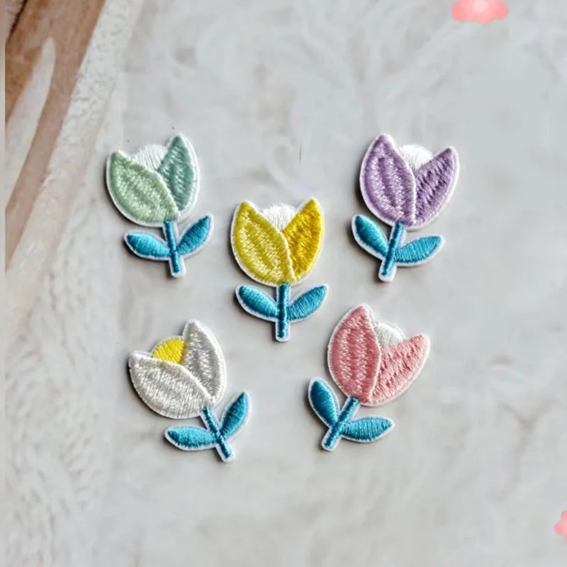 Self Adhesive 5pcs Cute Tulip Flower Embroidered Patches for Clothing Wallet Iron-on Clothes Hole Repir Needlework Sewing Craft