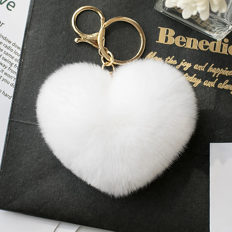 Solid Color Fluffy Pompom Keychain Gifts For Women Soft Heart Shape Pompon Fake Rabbit Key Chain Car Bag Accessories Key Ring