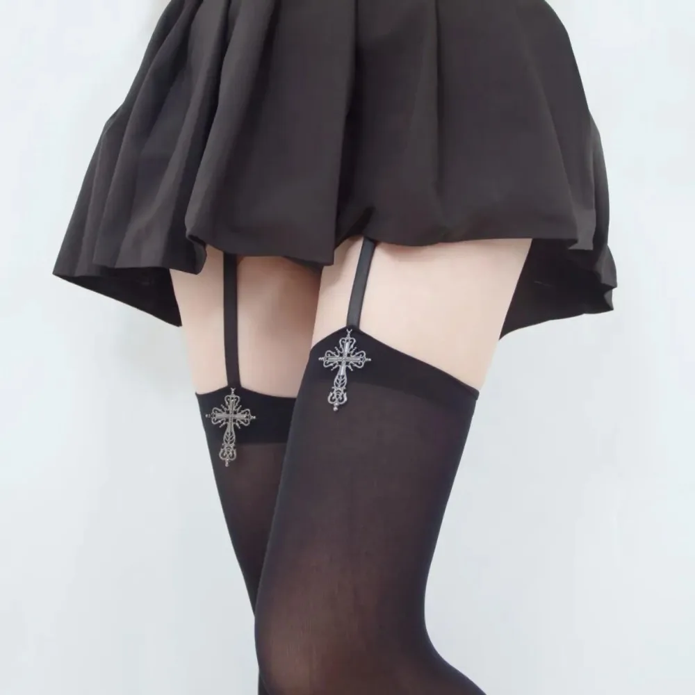 1/2 pair of gothic cross-ornamented women's tights, solid color, thin, over-the-knee Lolita socks