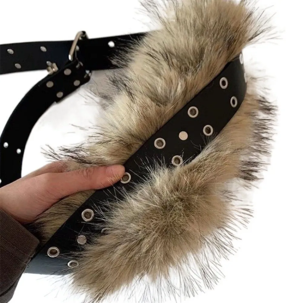 Vintage Furry Fur Waist Belts PU Leather Y2K Double Grommet Belt Plush Cowgirl Waistband Girls