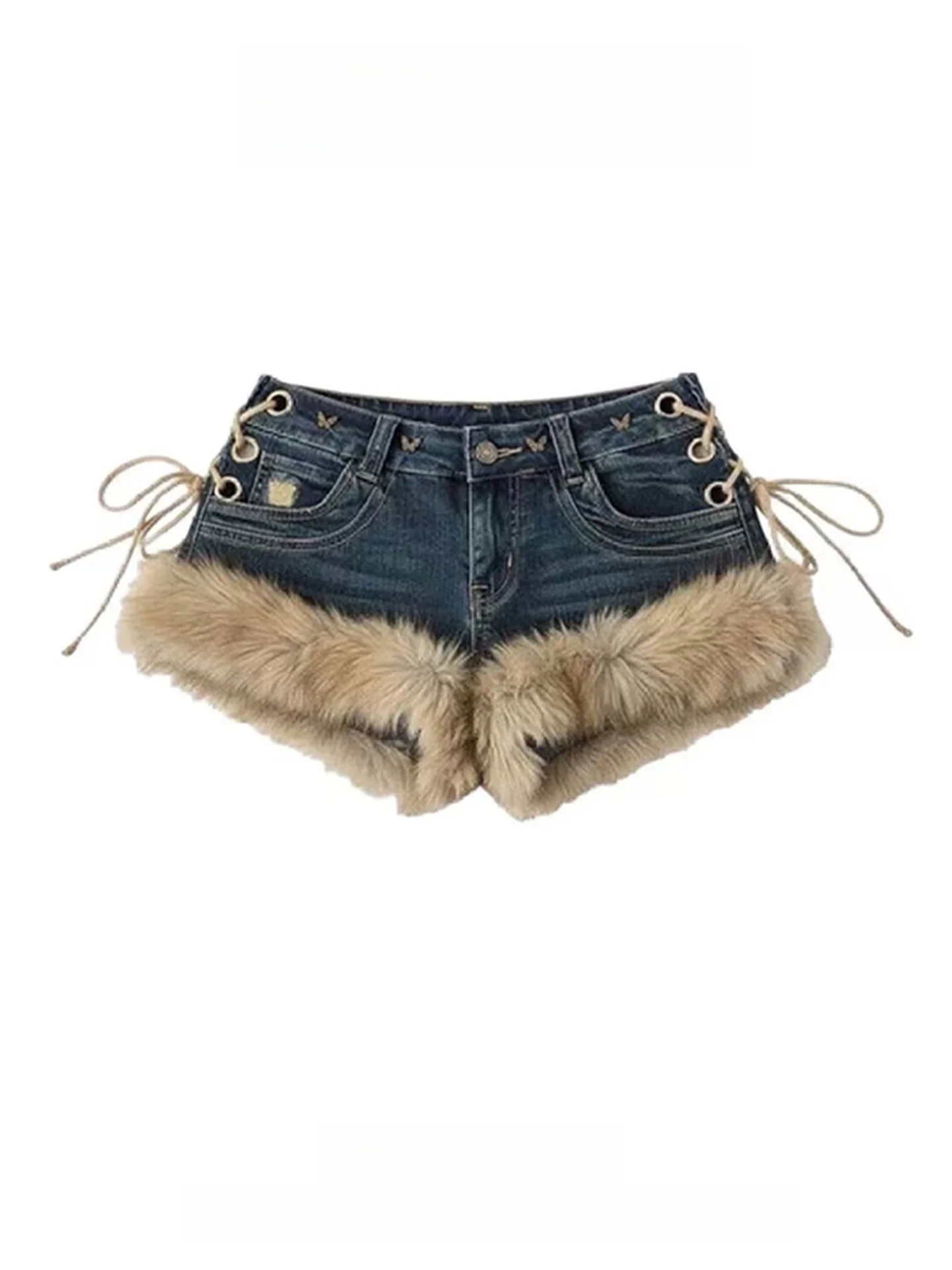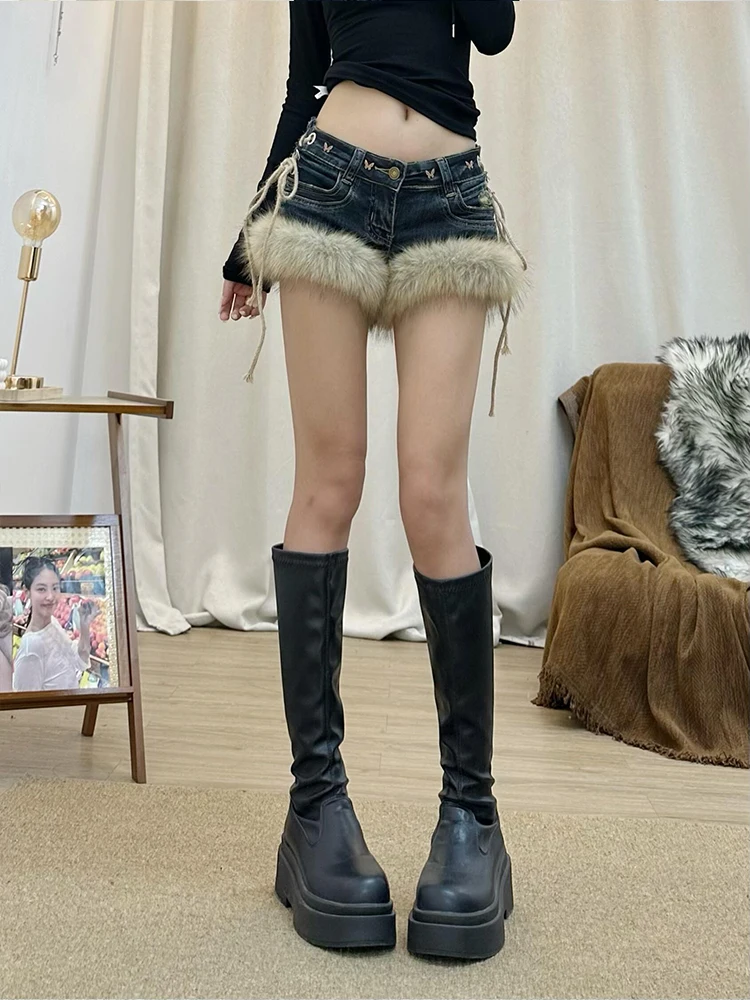 Y2K Millennium Spicy Girl Plu Denim orts Women's Low Waist Slimming Furry Splice Wrap around A-Line Hot Pants
