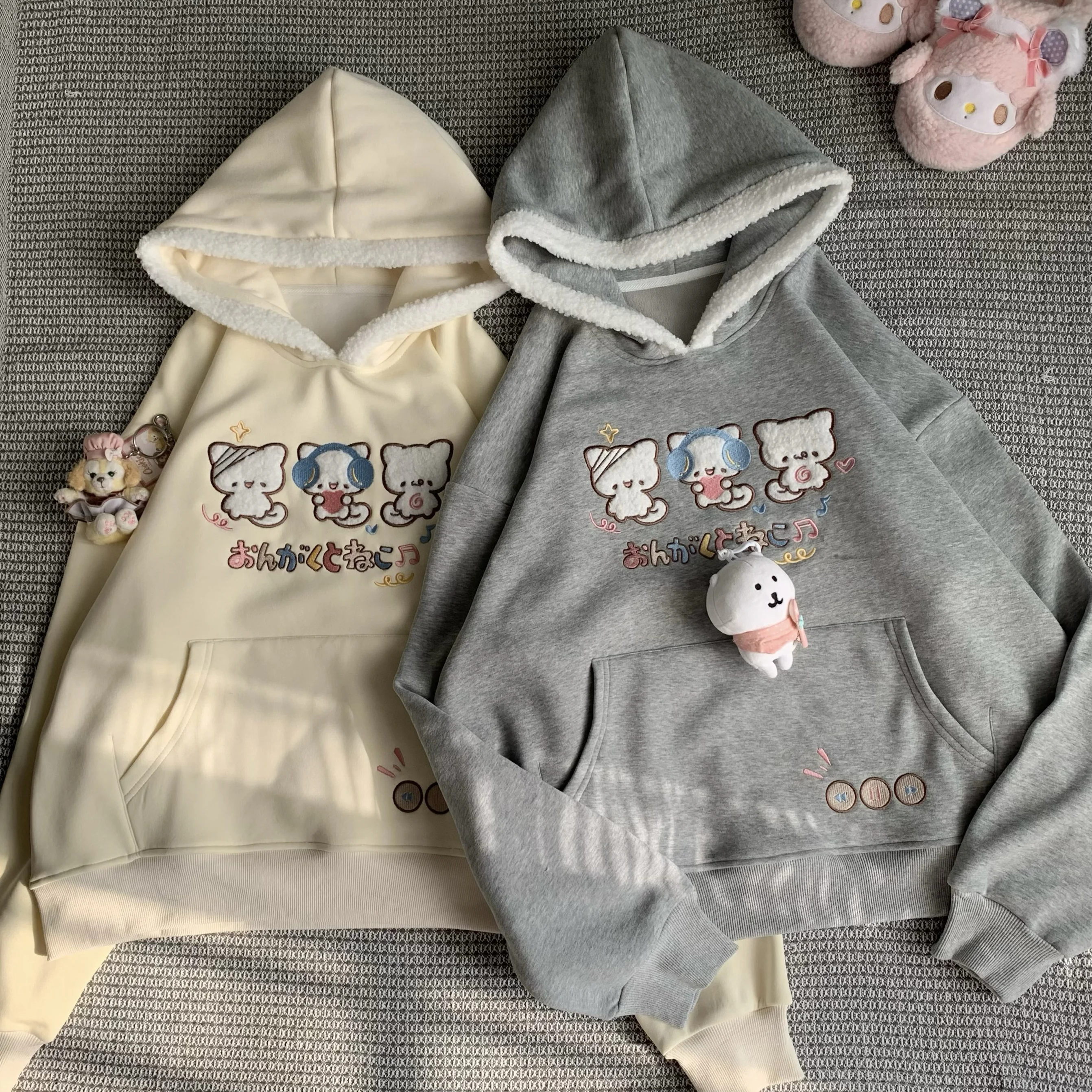 Cute Print Long Sve Furry Hat Jaet Soft Girl Sli Versatile Hooded Earphone Hole Winter Warm Comfortable Sweatirt