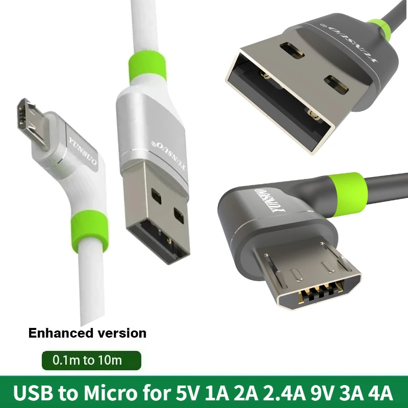 USB 2.0 To Micro Android Elbow 90 Degree 5V 2.4A 9V 3A 4A 20W 40W Quick Charging Data Cable 5m 8m VR Digital Camera Car Recorder