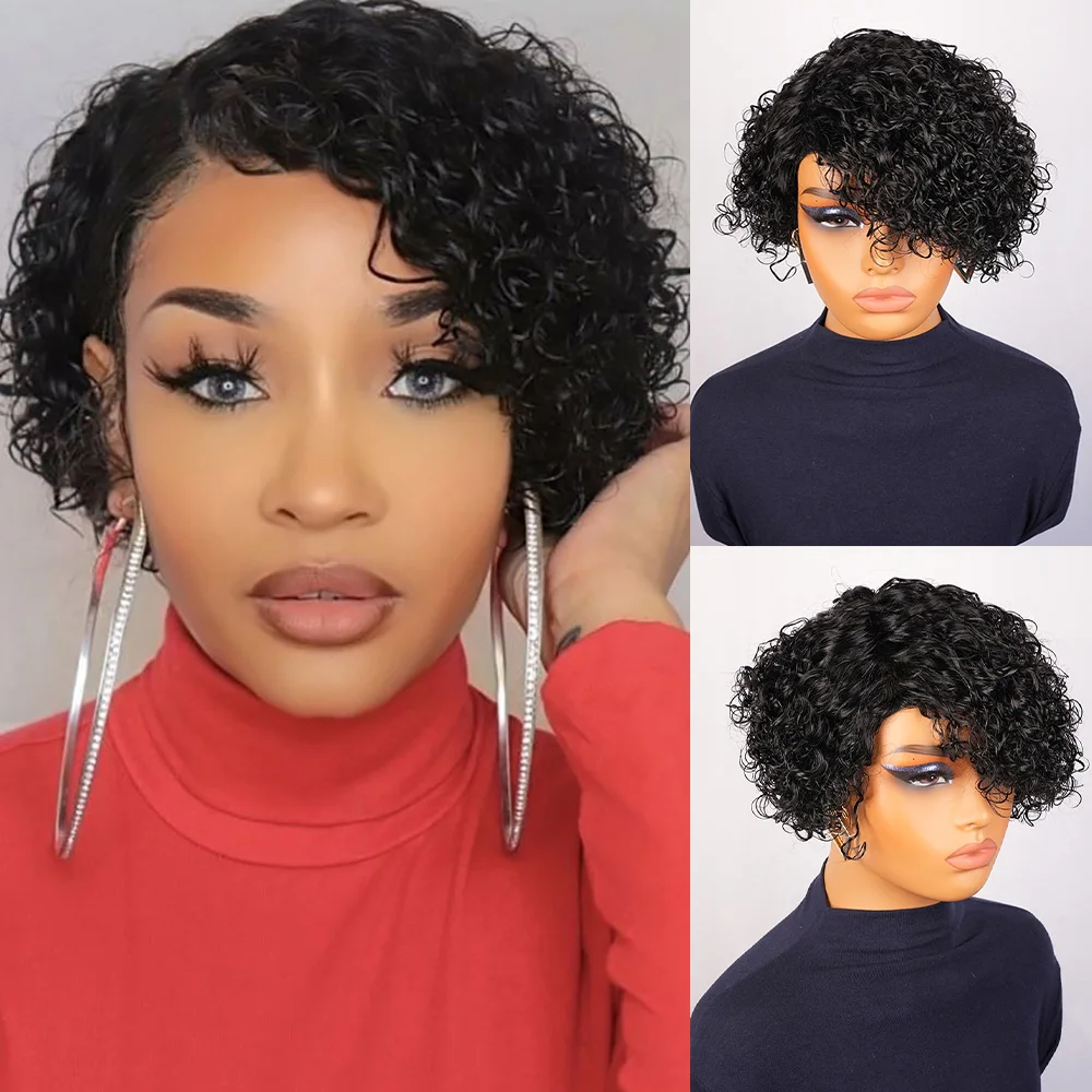 Pixie Cut Human Hair Wigs For Black Women Afro Rose Curly Wigs With Bangs Short Bouncy Curly Bob Wig Full Machine-Made Wig