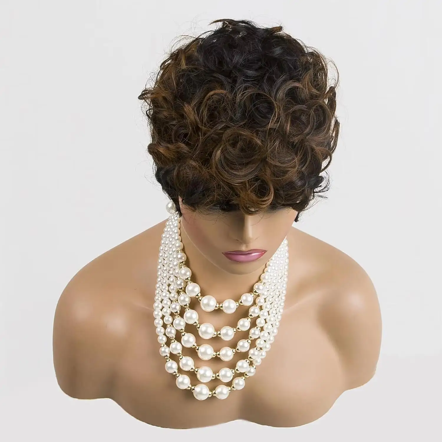 Synthetic Pixie Cut Wig for Women Short Brown Wigs with Bangs Natural Looking Old Lady Mommy Hair Repalcement Wig Daily Costume