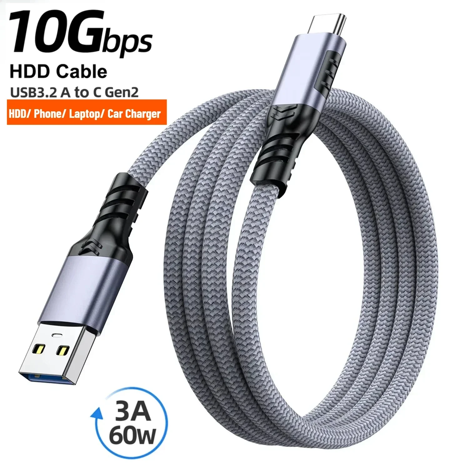 USB3.2 Gen2 10Gbps Cable USB A to C Cable 3A 60W QC3.0 Fast Charging for Samsung NVMe Hard Disk External Android Data Braid Cord