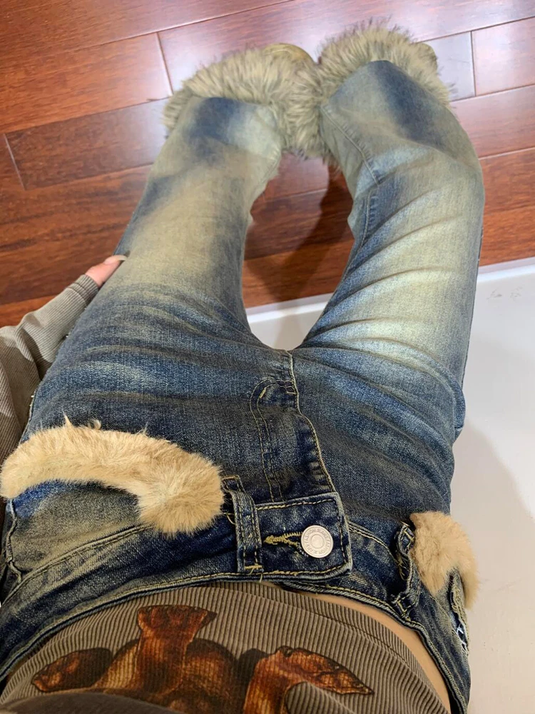 American Sle Spicy Girl Design Sense Furry Patchwork Jeans Women's Autumn Winter High Street Vintage Slim Micro Flared Pants