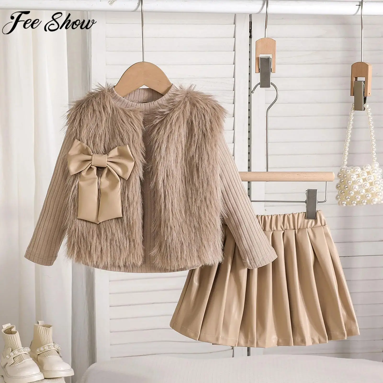 Children Girls Winter Fashion Warm Birthday Party Outfit Furry Faux Fur Bow Vest Coat with Knitted Top PU Pleated Skirt 3pcs Set