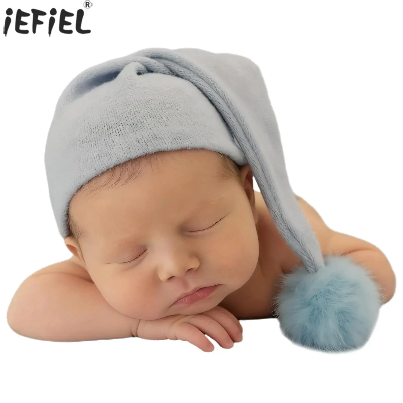 Baby Boys Girls Furry Ball Knitted Hat Newborn Photography Props Solid Color Stretchy Knit Hats Photo Shoot Costume Accessory