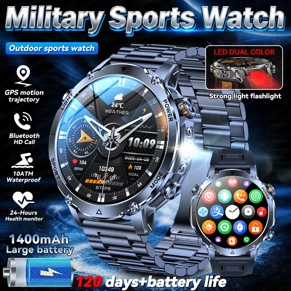 2026 New Military Durable 1400mAh Battery Smart Watch IP69K Waterproof Bluetooth Call Heart Rate HD AMOLED Men Sports Smartwatch