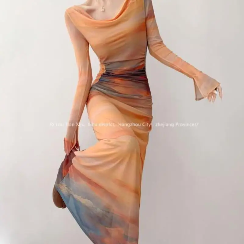 Kawaii Girl Fashion Tops Sexy Midi Skirt Mesh Print Swing Neck Dress Women Elegant Contrast Color Slim Fit Waist Slim Sexy