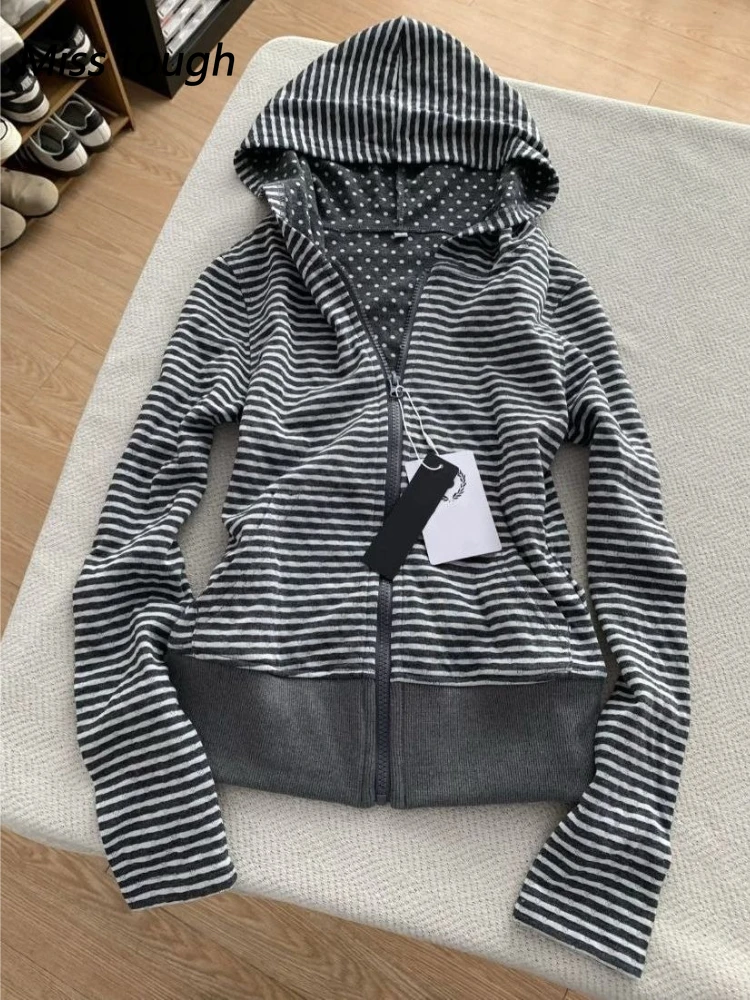 Winter Warm Korean Fashion Y2k Women's Jacket Grey Striped Polka Dot Slimming Coat Tops E-girl High Street Design Woman Clothes