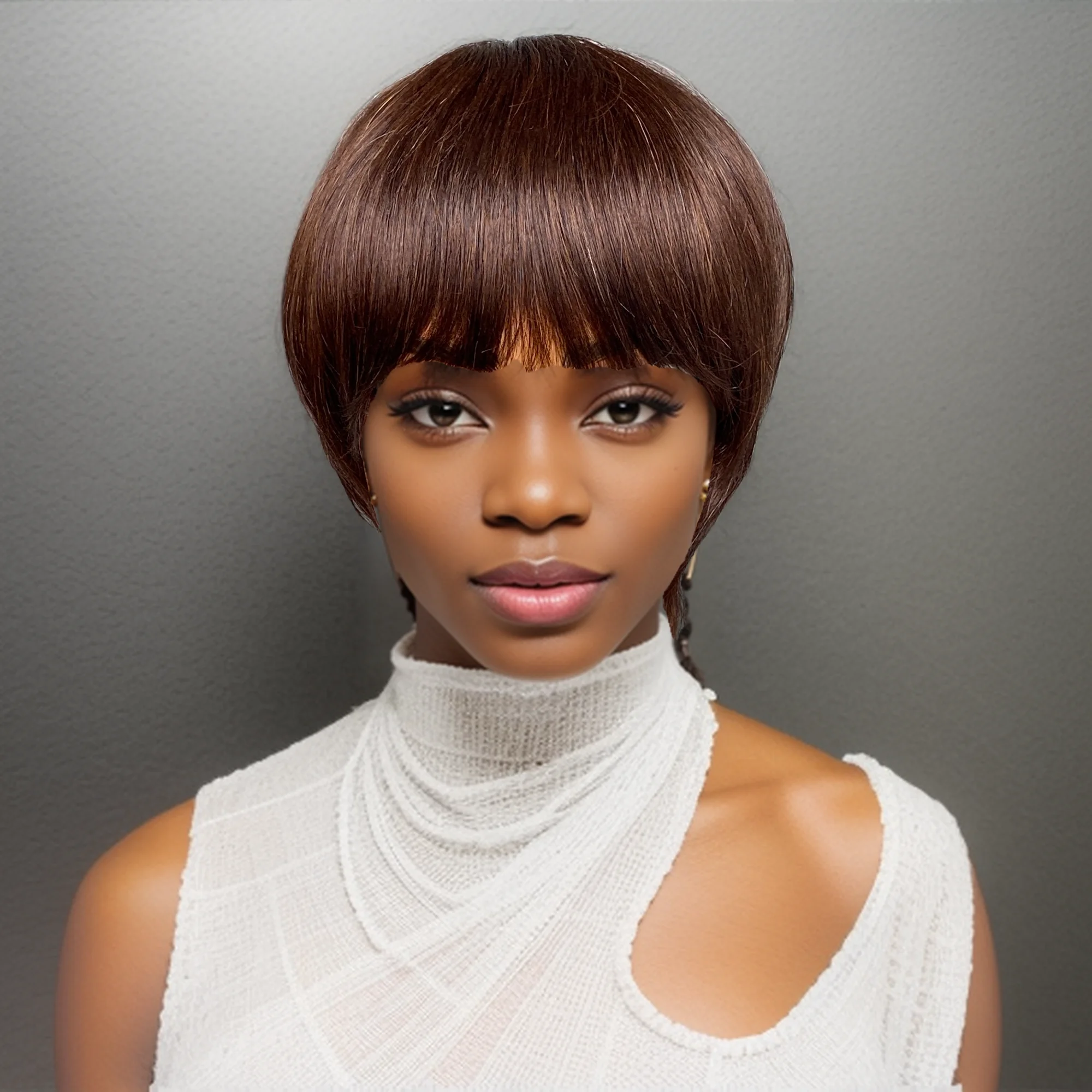 Brown Straight Pixie Cut Short Straight Layered Fringe Human Hair Wig 6 Inch Rose Net Cap Easy To Wear Machine Made Wig