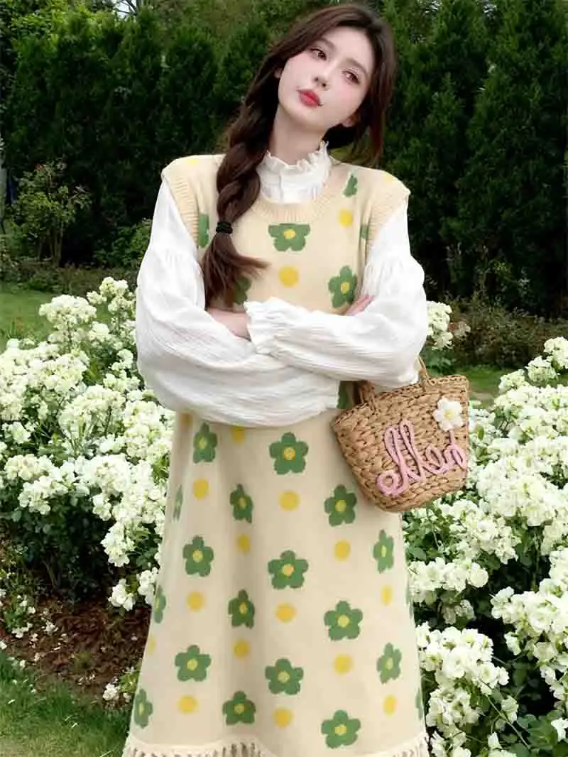 Knitted Sleeveless Dresses Elegant Womens Spring Shiny Stacked Flowers Cinch Skin-Friendly Square-Neck Patched Minimalism Simple