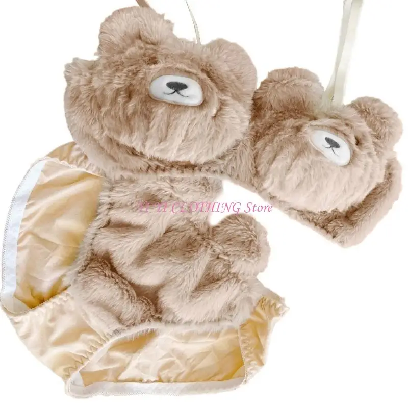 N5KF Women's Girls Plush Underwear Female Anime Cartoon Bear Pattern Furry Bra and Panty Set Winter Lingerie Intimates