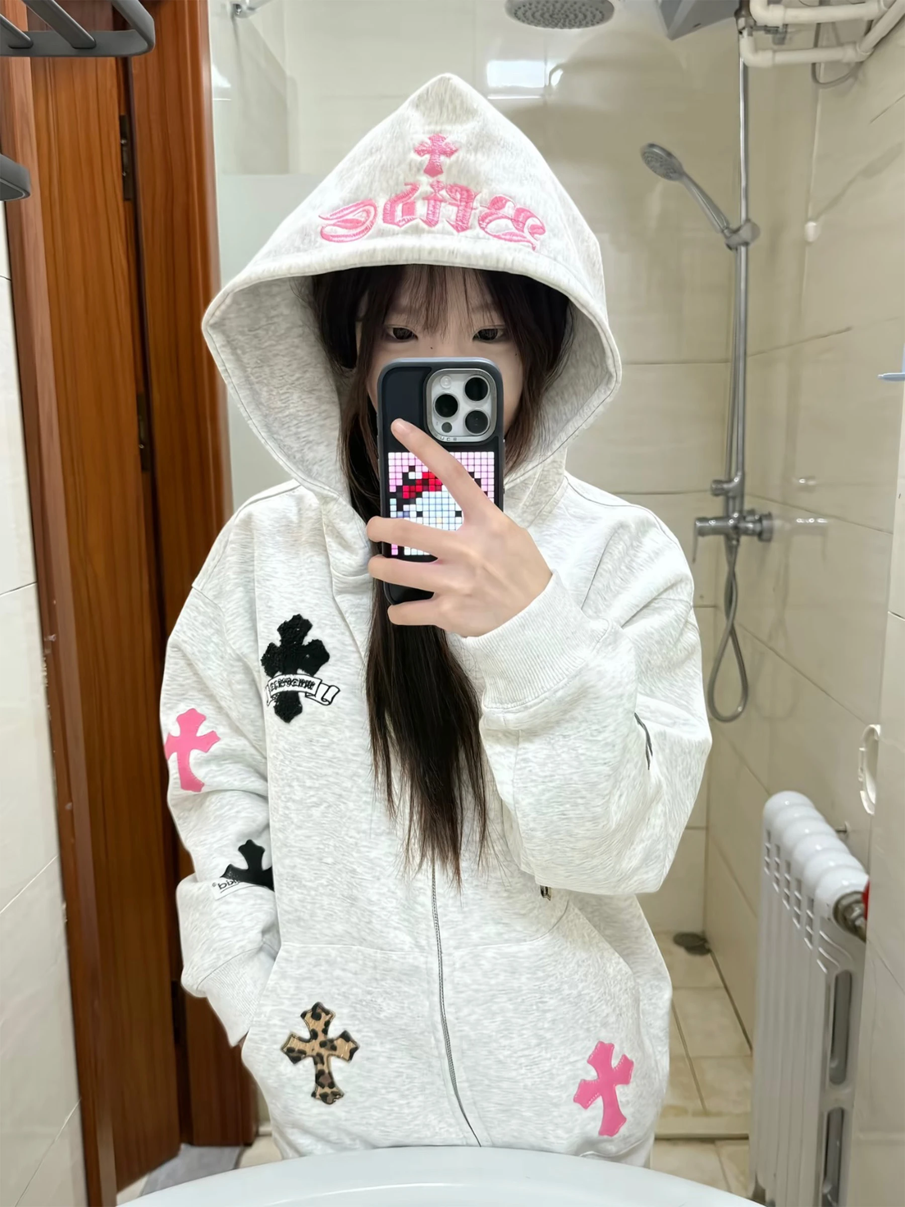 Women's Oversized Fce Lined Hoodie Embroidered Letter Cross Patch Sweatirt Korean Sle Spring Autumn Winter Casual Wear