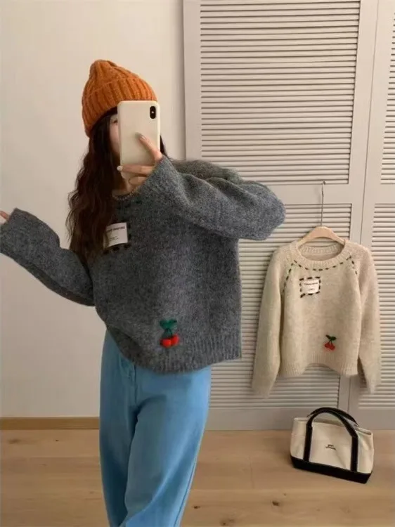 Loose Fit Women's Knitwear Cherry Embroidery Lazy Sle Autumn Winter Sweater Korean Patch Letter Top Cotton Blend Long Sve