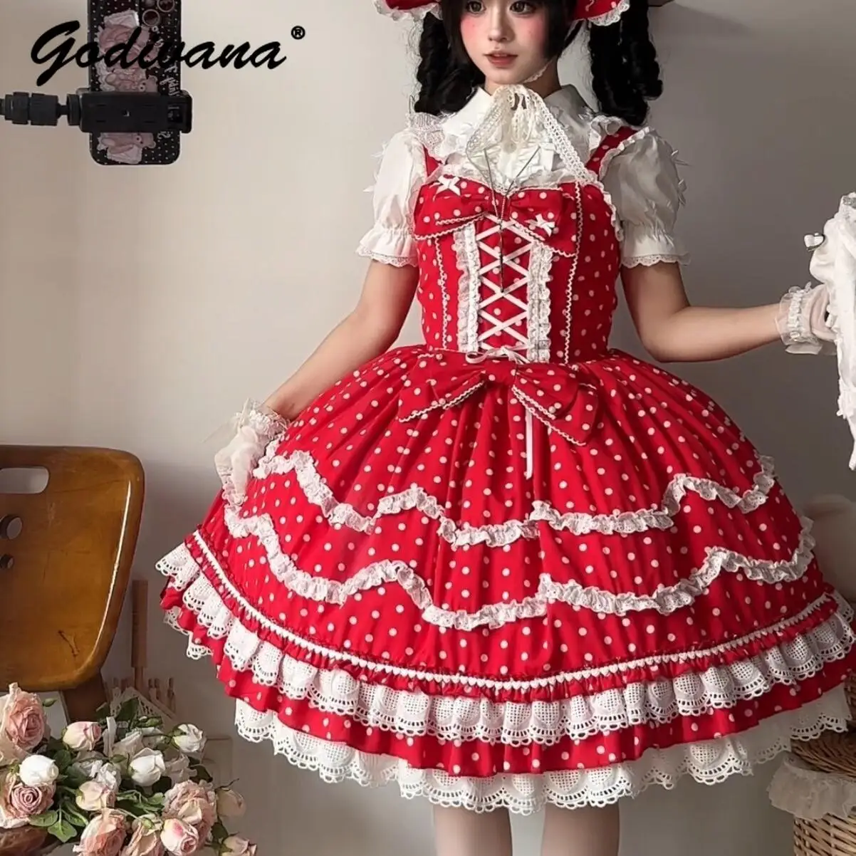 New Spring and Summer Female Girls Lolita Red Polka Dot Jsk Dress Short Sleeve Cotton Shirts and Bnt Womens Retro Sweet Outfits