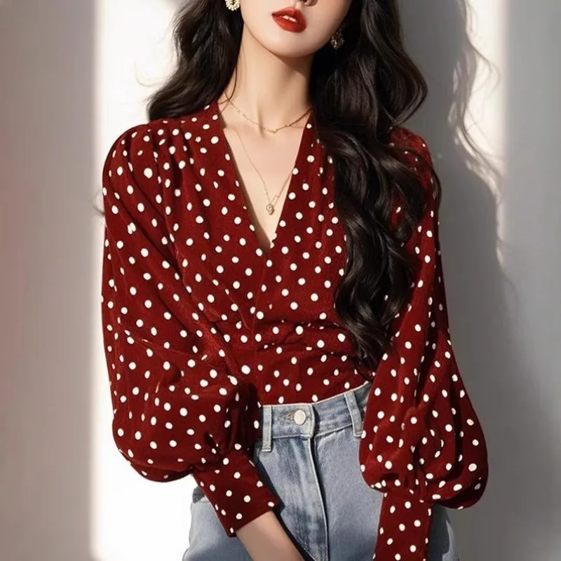 Spring Autumn Women's Wine Red Polka Dot Chiffon Blouses V-Neck Bishop Sleeve Back Knotted Adjustable Waist Design Top