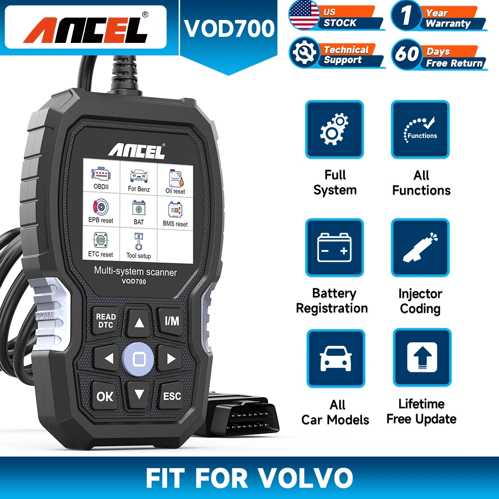 ANCEL VOD700 All System OBD2 Scanner for Volvo Car Diagnostic Tool ABS Bleeding Injector EPB DPF ABS Oil Reset Car Code Reader